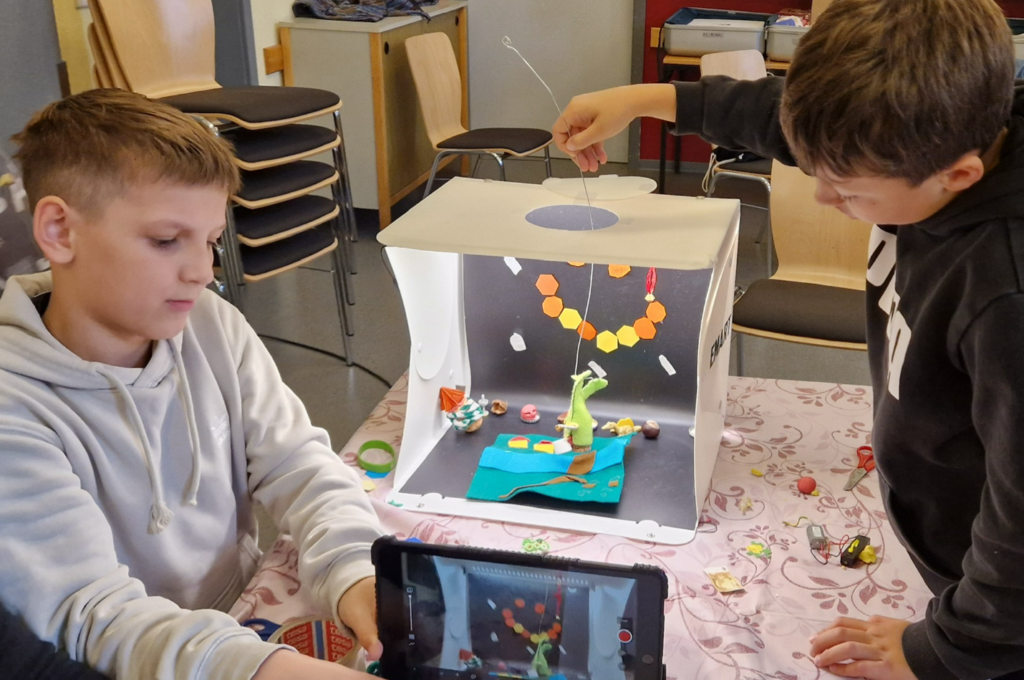 Ein besonderes Highlight war die Erstellung eines eigenen Kurzfilms mit Hilfe der Stopmotion-App. Hierbei waren Kreativität und handwerkliches Geschick gefragt. Jedes Team musste sich ein Konzept überlegen, Bühnenbild entwerfen und die Requisiten herstellen. Danach wurden mit viel Geduld und Geschick die einzelnen Szenen aufgenommen und bearbeitet.