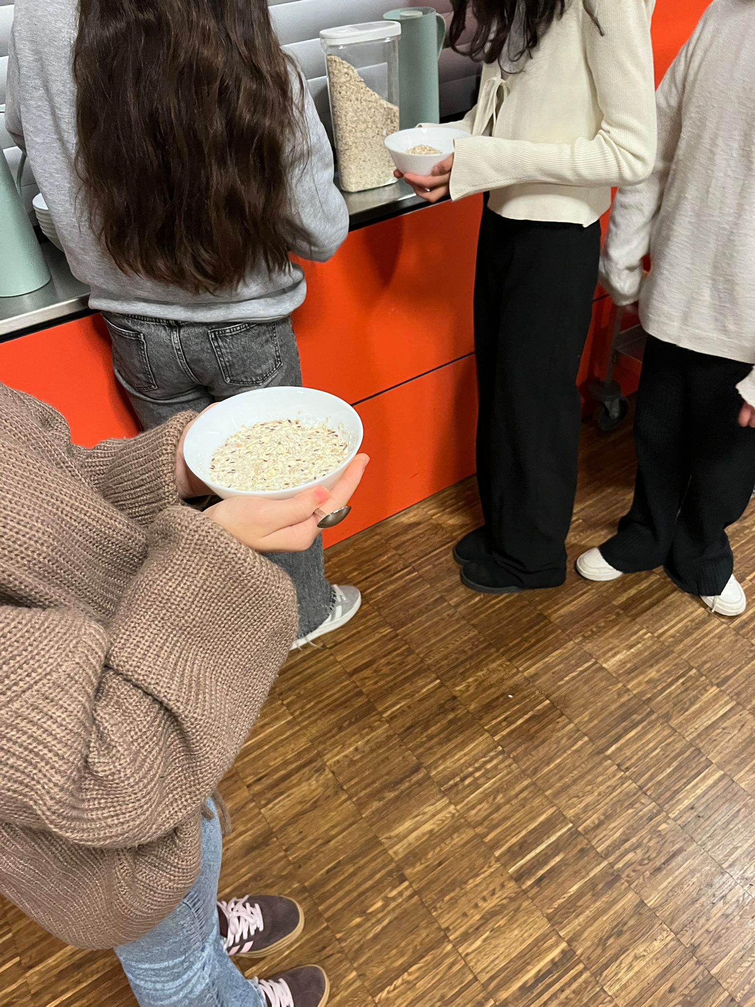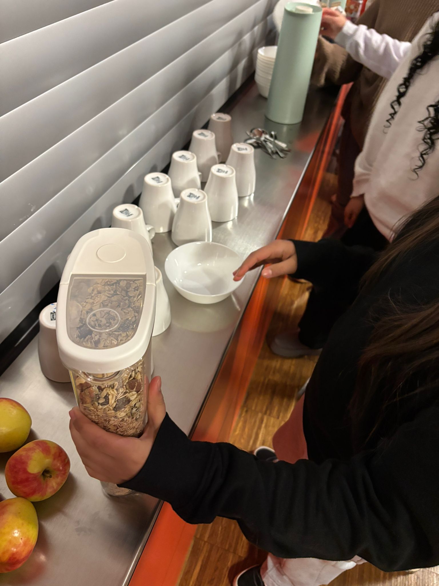 Heute fand zum ersten Mal das Luisencafé statt. Alle Kinder der Luisenschule durften ihren Schultag in der Mensa gemütlich bei einer Tasse Tee oder mit einer Schüssel Müsli starten. Die Lebensmittel und Getränke werden von Gut Wilhelmsdorf geliefert. Das ist ein Bio Bauernhof in Gütersloh.