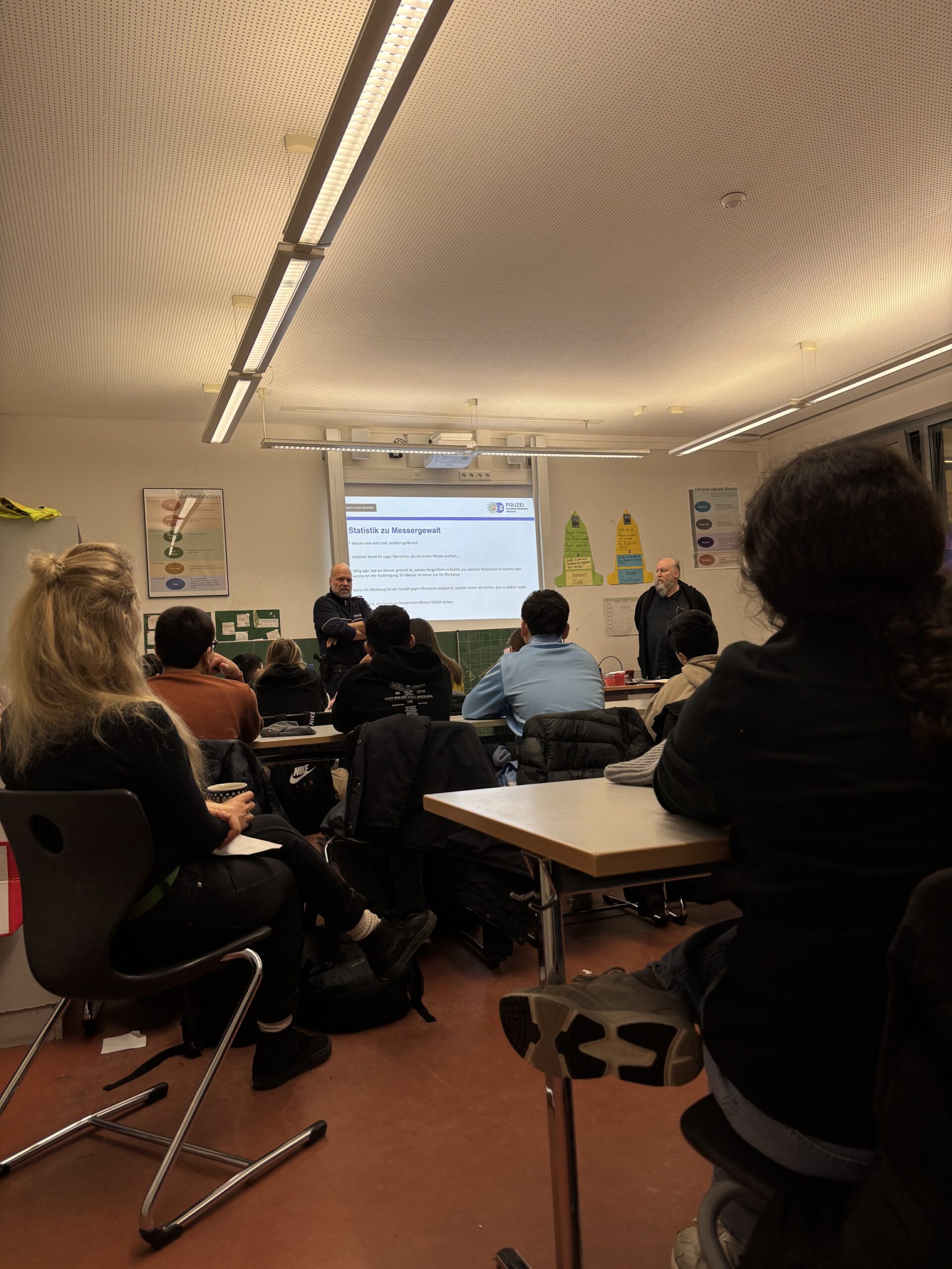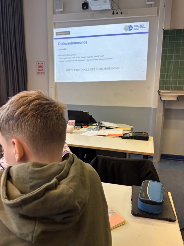 Am 14. und 15. Januar nahmen alle 6. Klassen am Präventionsprogramm „Messergewalt- Prävention und Stärkung“ teil. In Zusammenarbeit mit der Polizei und der Schulsozialarbeit setzten sich die Schülerinnen und Schüler mit Gewaltprävention, Konfliktlösung und einem respektvollen Miteinander auseinander. Es ist wichtig zu betonen, dass es ein stadtweites Präventionsprogramm der Polizei ist und wir derzeit keine Probleme auf Hinblick Messergewalt haben. Dennoch möchten wir proaktiv handeln und unserer Schülerinnen und Schüler für dieses Thema sensibilisieren.