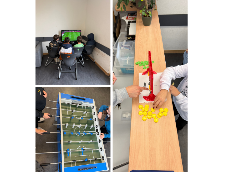 Freizeitraum mit Kickern, Billard, einer PlayStation, sowie Gesellschaftsspielen und einer Ruhezone. Diese ermöglicht den Schüler:innen sich zurückzuziehen und die Pause selbst zu gestalten.